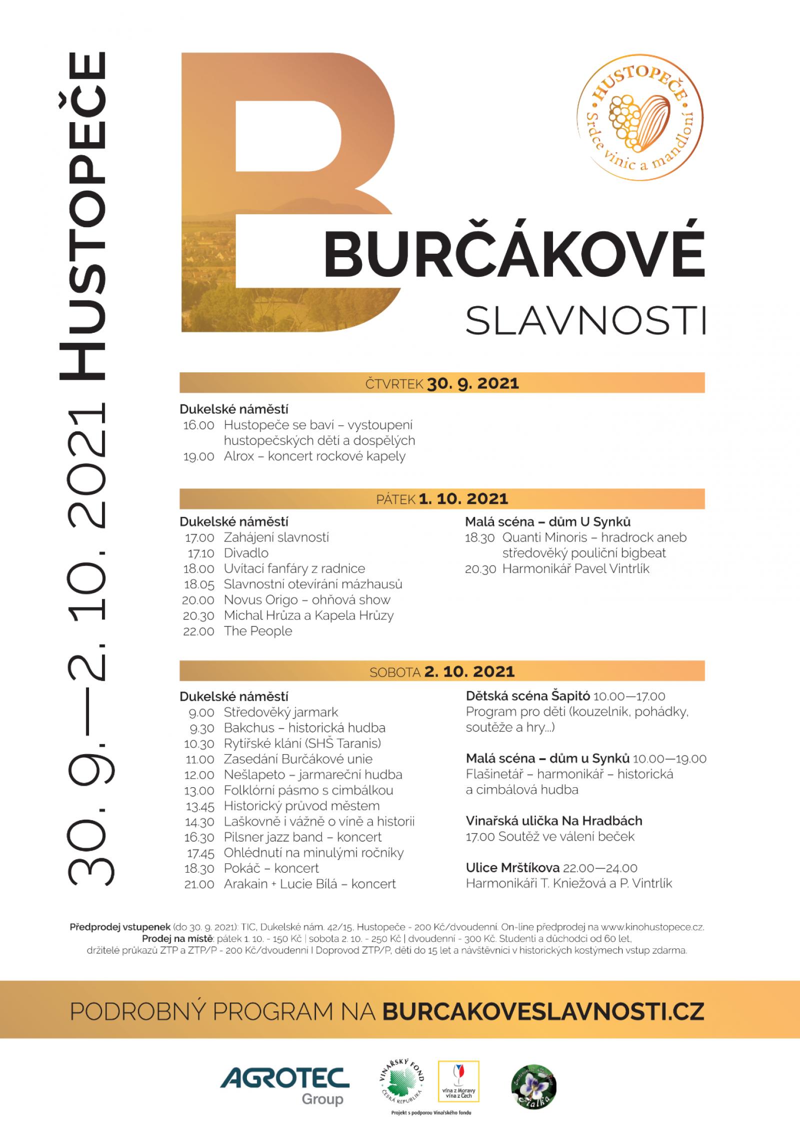 Součástí Burčákových slavností je i bohatý doprovodný program, letos vystoupí například Michal Hrůza, Pokáč a kapela Arakain s Lucií Bílou.