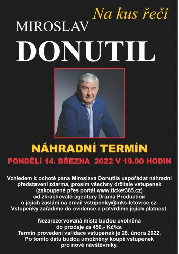 Populární herec, bavič, vypravěč Miroslav Donutil se představí ve své one man show Na kus řeči.