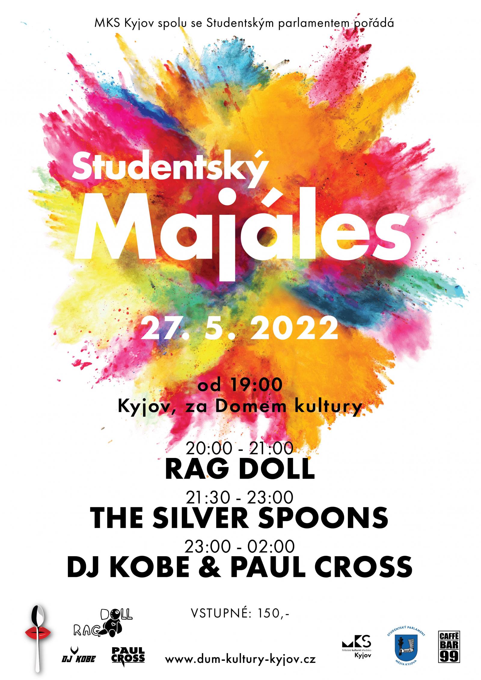 Městské kulturní středisko Kyjov ve spolupráci s kyjovským Studentským parlamentem vás zvou na Studentský Majáles. Po 2 leté pauze se opět vrací oblíbená studentská akce zpět do Kyjova. Čeká vás nabitý program. Těšit se můžete na RAG DOLL, THE SILVER SPOONS nebo na DJ KOBE & PAUL CROSS. Partnerem celé akce je Caffé bar 99.