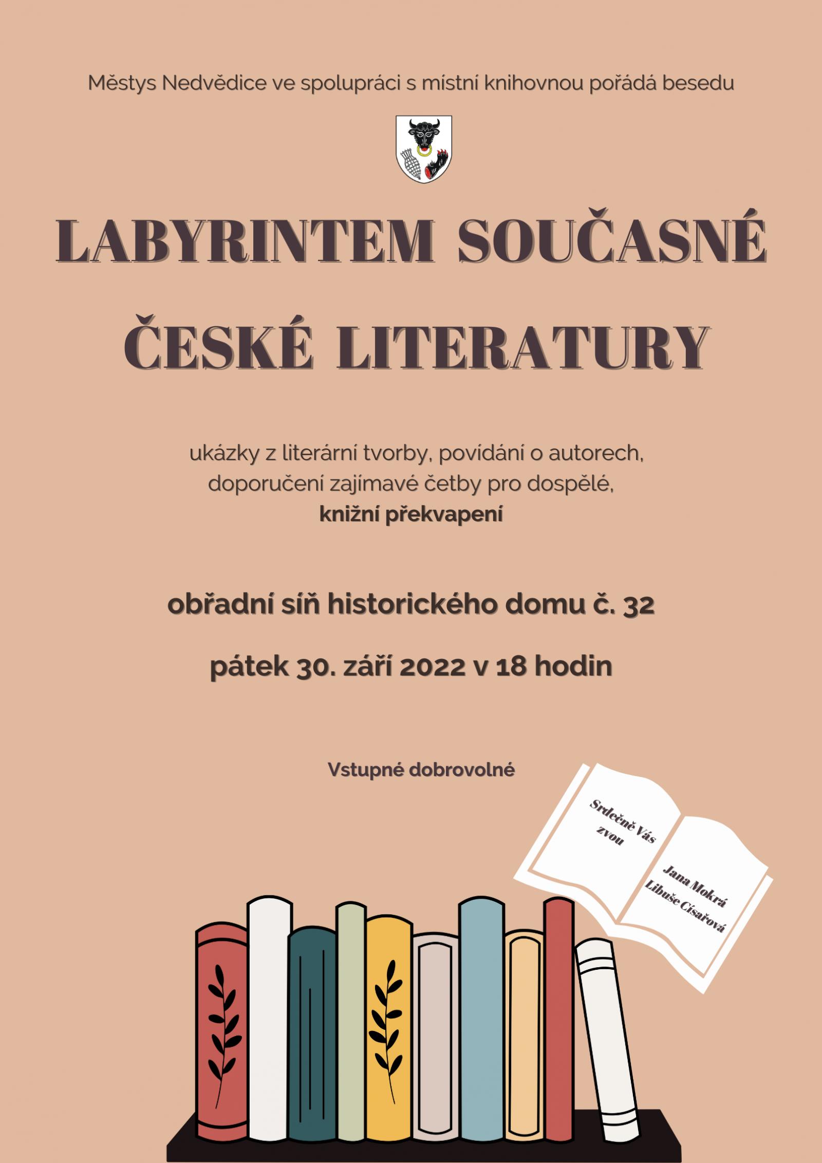 Srdečně zveme na besedu Labyrintem současné české literatury, která se koná 30.9.2022 od 18 hodin v obřadní síni historického domu čp. 32 v Nedvědici. Přednáší Jana Mokrá a Libuše Císařová.