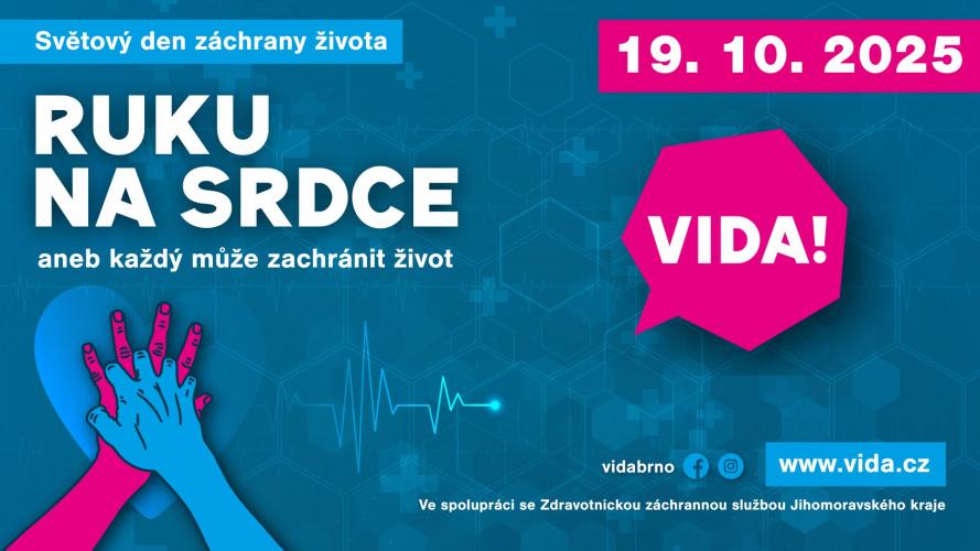 Ruku na srdce! Víte, jak poskytnout první pomoc? Přijďte v neděli 19. října do VIDA! science centra a zažijte, jak správně postupovat při resuscitaci. Vyzkoušejte si práci s AED nebo zjistěte, jak rozpoznat srdeční zástavu, zavolat záchranku a zahájit nepřímou srdeční masáž.