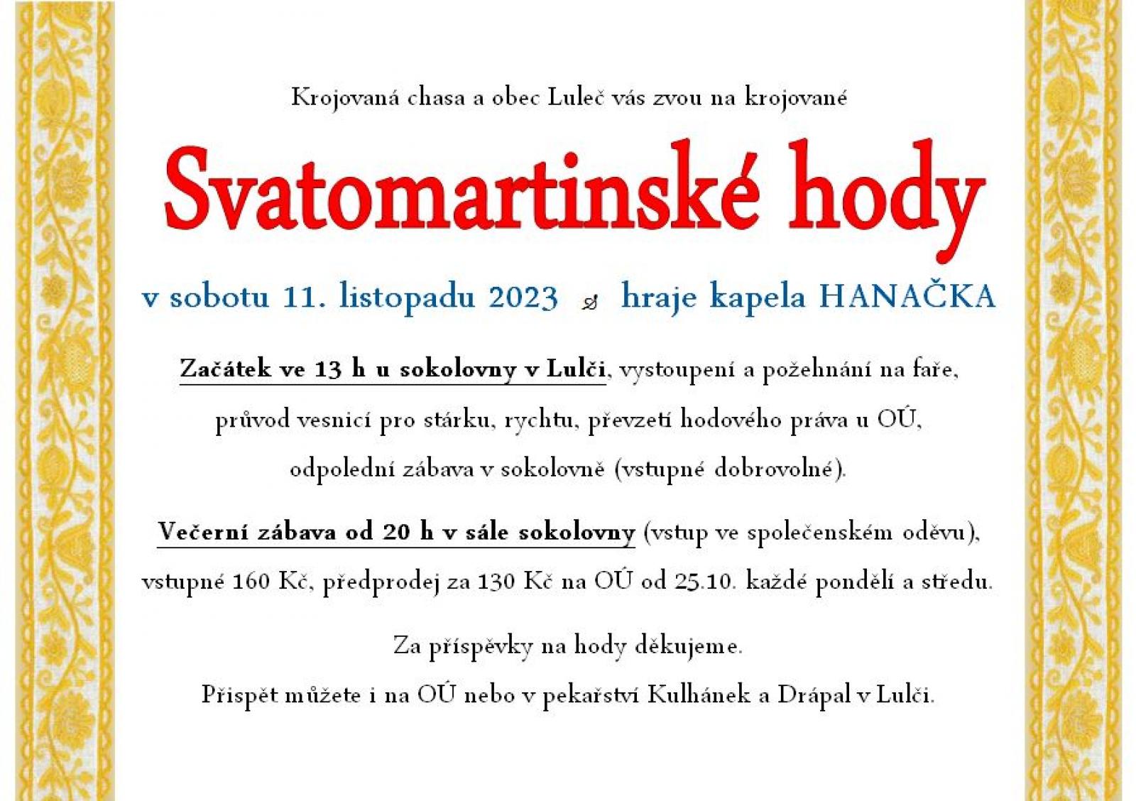 Začátek ve 13:00 hod u Sokolovny v Lulči, vystoupení a požehnání na faře, průvod vesnicí pro stárku, rychtu, převzetí hodového práva u OÚ. Odpolední zábava v sokolovně (vstupné dobrovolné).