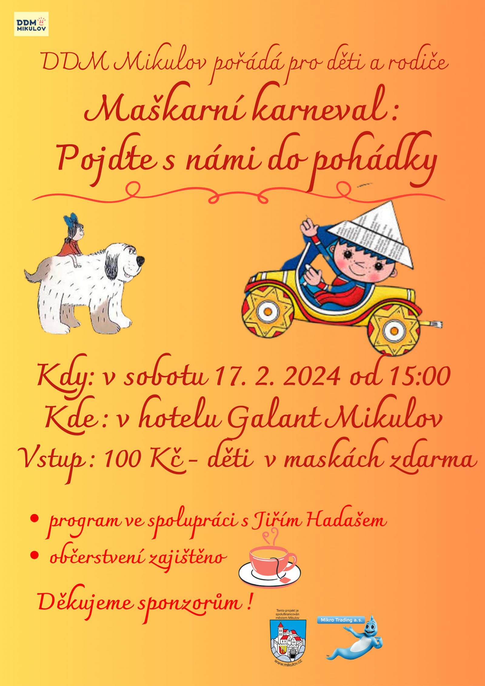 V sobotu 17. února 2024 od 15.00 do 18.00 hodin se ve velkém sále hotelu Galant Mikulov uskuteční maškarní karneval Pojďte s námi do pohádky. Program ve spolupráci s Jiřím Hadašem.