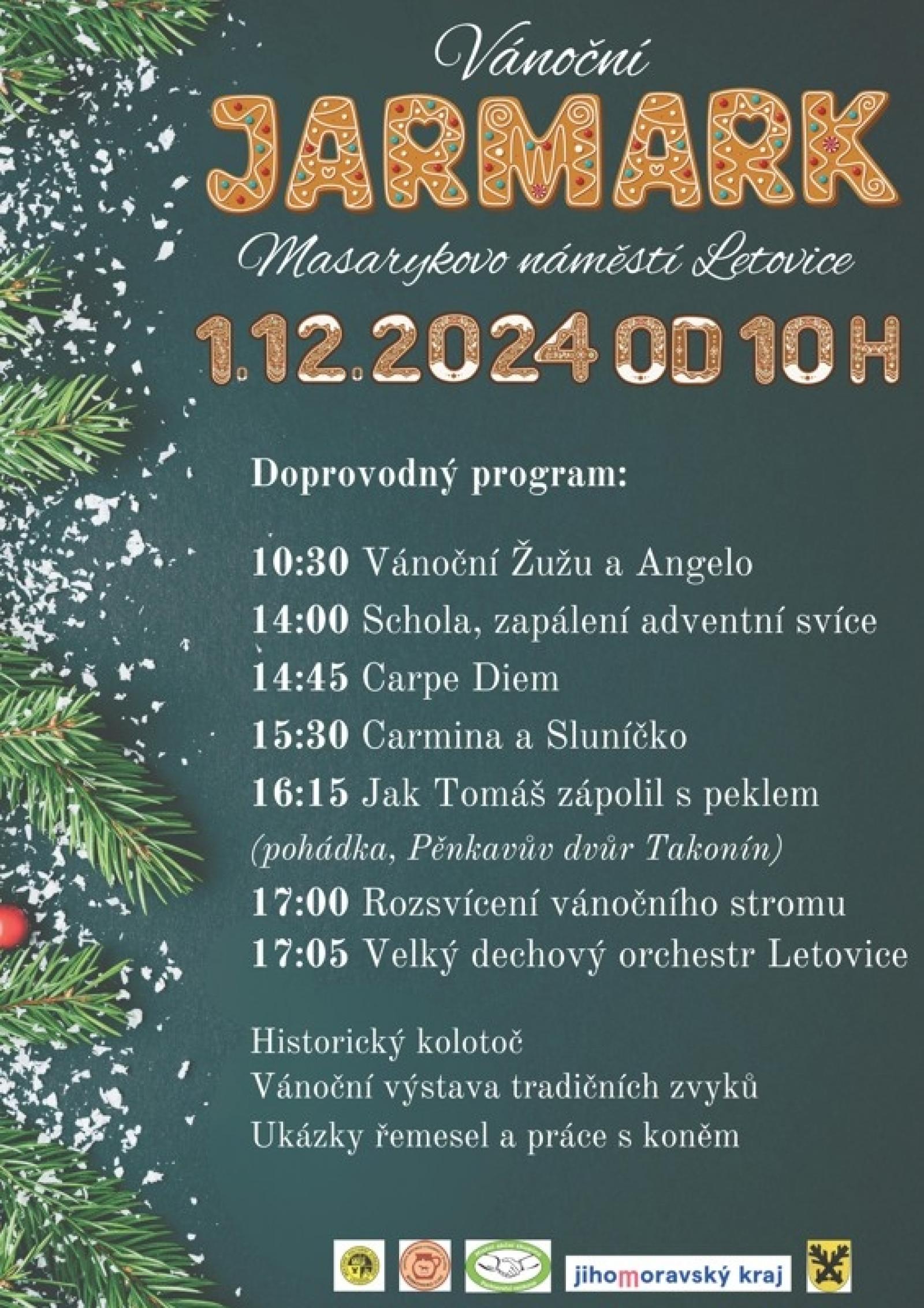 Doprovodný program: 10.30: Vánoční Žužu a Angelo, 14.00: Schola, zapálení adventní svíce, 14.45: Carpe Diem, 15.30: Carmina a Sluníčko, 16.15: Jak Tomáš zápolil s peklem (pohádka), 17.00: Rozsvícení vánočního stromu, 17.05: VDO Letovice