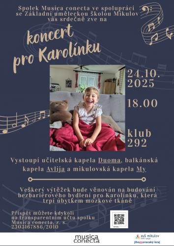 Koncert pro Karolínku se uskuteční v Clubu 292 v Mikulově v pátek 24. října od 18.00 hodin. Vystoupí učitelská kapela Duoma, balkánská kapela Avlija a mikulovská kapela My.