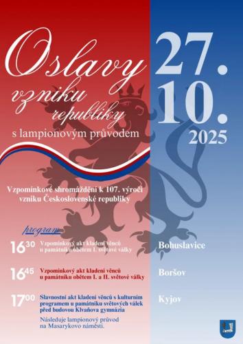 Město Kyjov vás srdečně zve na oslavy vzniku republiky s lampiónovým průvodem a kladením věnců. Vzpomínkový akt se bude odehrávat na 3 místech: