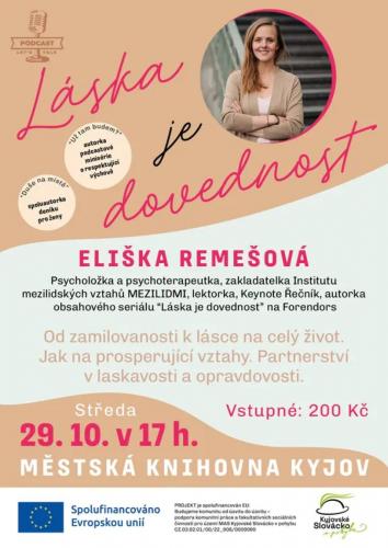 Eliška Remešová, psycholožka a psychoterapeutka s cílem zlepšování duševního a sociálního zdraví. Zakladatelka institutu MEZILIDMI, spoluautorka terapeutického deníku pro ženy „Duše na místě", propagátorka respektující výchovy v podcastu „Už tam budem?", autorka seriálu „Láska je dovednost".