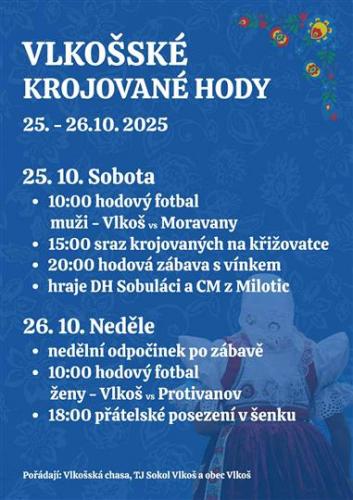 25.10.(SO) - 10:00 hodový fotbal (muži); 15:00 sraz krojovaných na křižovatce; 20:00 hodová zábava v sokolovně, k tanci a poslechu hraje DH Sobuláci a CM z Milotic