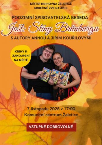 Beseda s autory knihy „Jošt: Stíny Brünburgu" Annou a Jiřím Kouřilovými se uskuteční v Komunitním centru Želetice na OÚ. Kniha k zakoupení na místě.