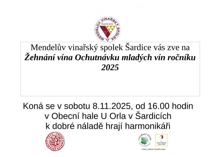 Mendelův vinařský spolek Šardice vás zve na žehnání mladých vín ročníku 2025.
