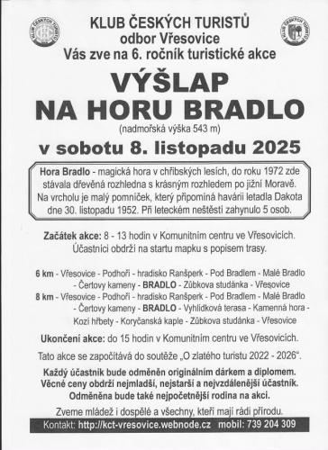 KČT odbor Vřesovice vás zve na 6. ročník turistické akce Výšlap na horu Bradlo.