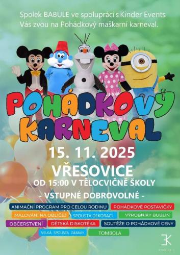 Akce se uskuteční v tělocvičně školy. Můžete se těšit na pohádkové postavičky, malování na obličej, výrobníky bublin, soutěže, animační program pro celou rodinu, tombolu...