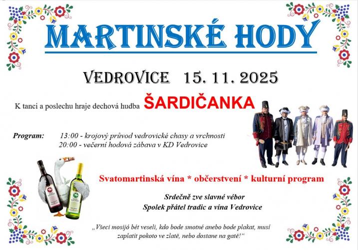 Spolek přátel tradic a vína Vedrovice a mladá chasa zve na Martinské hody v sobotu 15.11.2025.