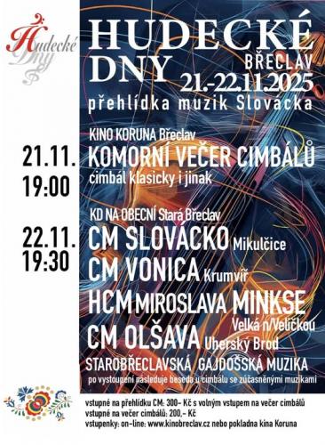 Dvoudenní setkání s folklorem zahájí v pátek 21. 11. v 19:00 hodin v kině Koruna Komorní večer cimbálů, v sobotu v 19:30 hodin následuje v KD Stará Břeclav vystoupení muzik a beseda u cimbálu.