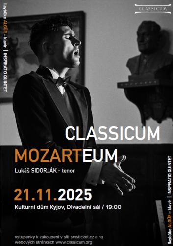 Zveme vás na jedinečný hudební večer, který propojuje krásu klasické hudby s mladistvou energií a osobitým pojetím. Projekt CLASSICUM MOZARTEUM se v rámci turné Cheb, Kyjov a Praha představí s exkluzivním programem, jehož základ je postaven na operní tvorbě Wolfganga Amadea Mozarta. Obsazení: Lukáš Sidorják - operní pěvec, Ilaybüke Algür - klavíristka a skladatelka původem z Istanbulu, Inspiratio Quintet - dechový kvintet.