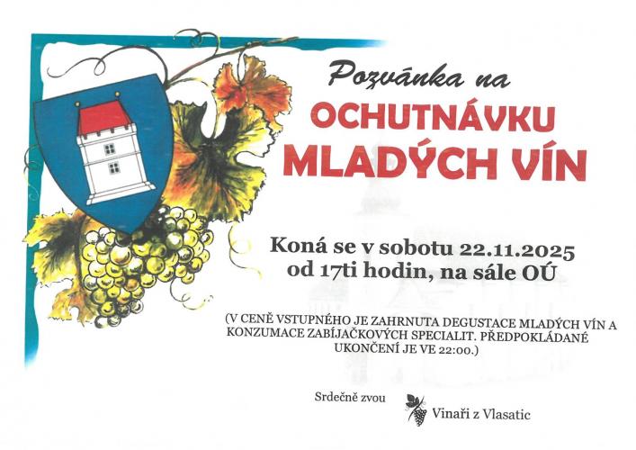 Vinaři z Vlasatic všechny srdečně zvou na Ochutnávku mladých vín, která se uskuteční v sobotu 22. listopadu 2025 od 17.00 hod na sále obecního úřadu ve Vlasaticích. V ceně vstupného je zahrnuta degustace mladých vín a konzumace zabíjačkových specialit). Těší se pořadatelé.