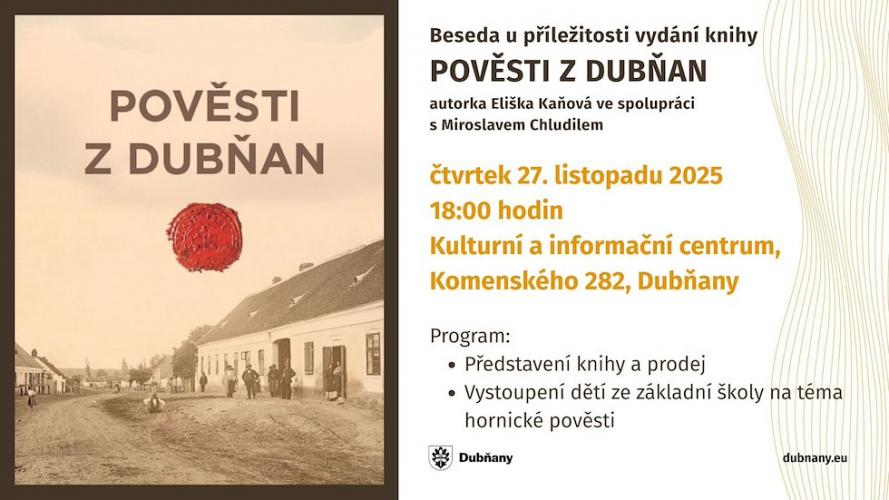 Jste srdečně zváni na besedu s autorkou u příležitosti vydání knihy „Pověsti z Dubňan".