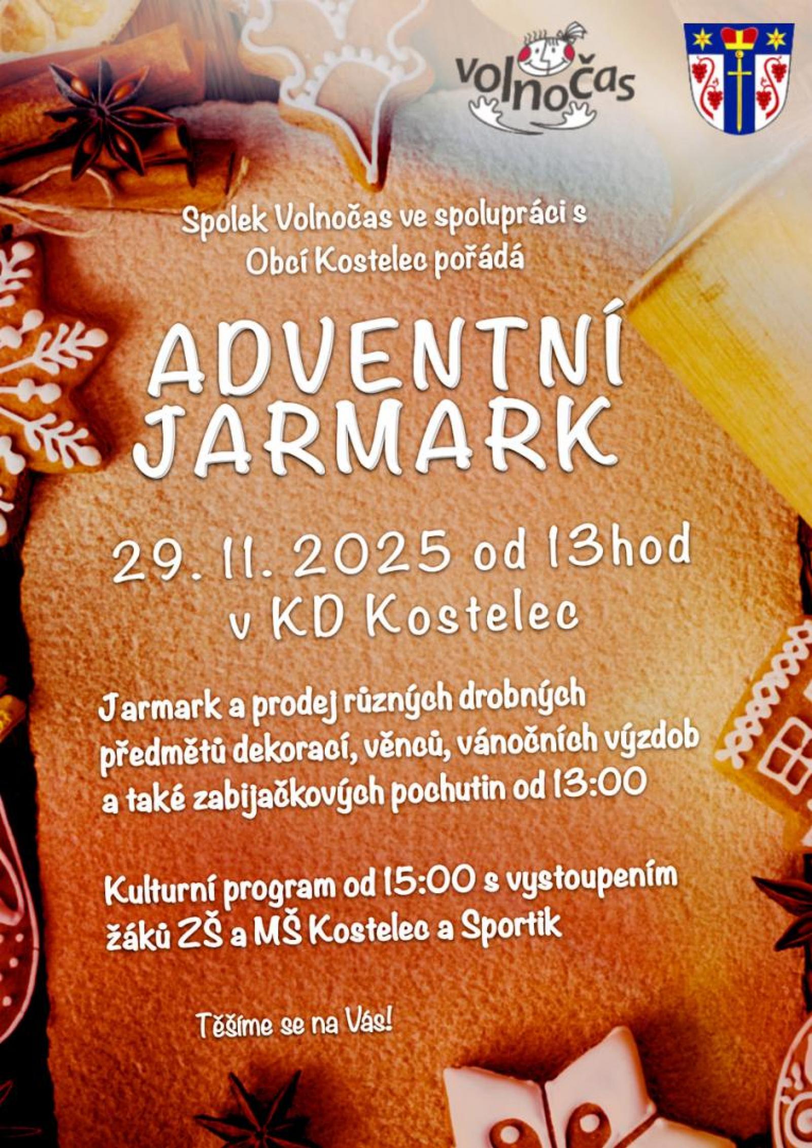 Spolek Volnočas a obec Kostelec vás srdečně zvou do KD na adventní jarmark.