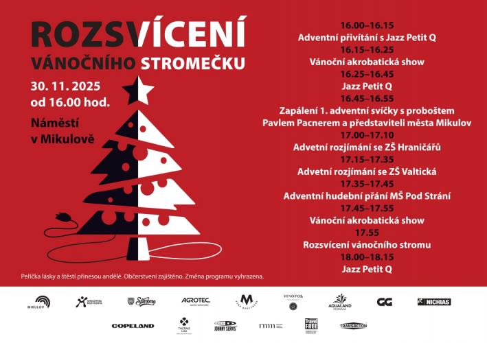 Srdečně vás zveme na každoroční akci slavnostního rozsvícení vánočního stromu, která proběhne 30.11. 2025 na 1. adventní neděli na Náměstí.