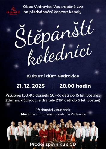 pořádá vánoční koncert Štěpánských koledníhů v neděli 21.12.2025 od 20 hodin v sále Kulturního domu ve Vedrovicích.