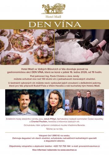 Zahraje cimbálová muzika Vladimíra Beneše. Cena za osobu 1990 Kč (zahrnuje ochutnávku vín i pokrmů).