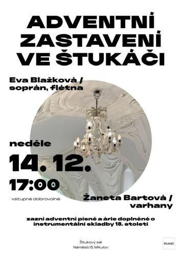 Ve Štukovém sále vystoupí Eva Blažková a Žaneta Bartová. Zazní adventní písně a árie doplněné o instrumentální skladby 18. století.