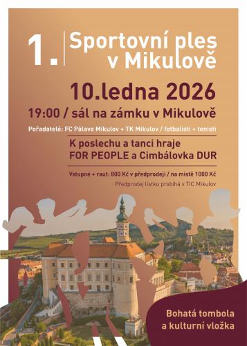 1. Sportovní ples se koná v sobotu 10. ledna od 19.00 hodin ve Velkém zámeckém sále na Zámku Mikulov.