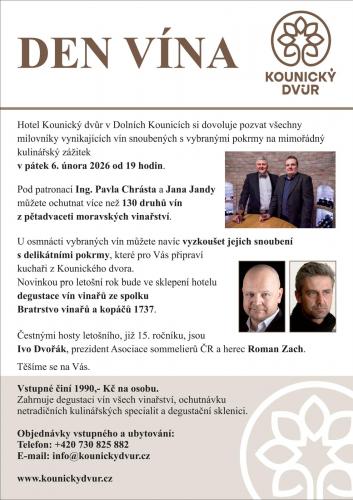 Hotel Kounický dvůr v Dolních Kounicích si dovoluje pozvat všechny milovníky vynikajících vín snoubených s vybranými pokrmy a dobrou muzikou na mimořádný kulinářský zážitek v pátek 6. února 2026 od 19 hodin.