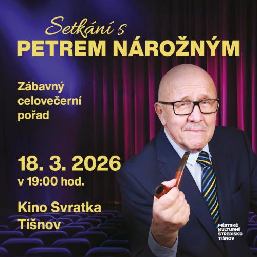 Ve středu 18. března 2026 přivítáme v sále kina Svratka od 19. hodin jednoho z nejpopulárnějších českých herců, komiků, vypravěčů a moderátorů, pana Petra Nárožného.