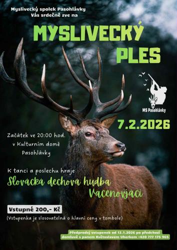 Myslivecký ples se bude konat v sobotu 7. února 2026 od 20.00 hod na sále kulturního domu v Pasohlávkách. K tanci a poslechu bude hrát Slovácká dechová hudba Vacenovjáci. Součástí akce bude i bohatá tombola. Vstupné 200 Kč, vstupenka je slosovatelná o hlavní ceny v tombole. (předprodej vstupenek po přwdchozí domluvě u pana Uherka, tel: 777 175 965). Těší se pořadatelé.