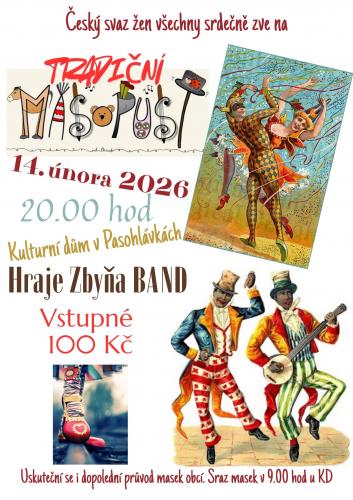 Český svaz žen Pasohlávky všechny srdečně zve na večerní zábavu s názvem Tradiční masopust, která se koná v sobotu 14. února 2026 od 20.00 hod v kulturním domě v Pasohlávkách. K tanci i poslechu hraje Zbyňa BAND. Součástí večera bude i bohatá tombola a tradiční pochovávání basy.