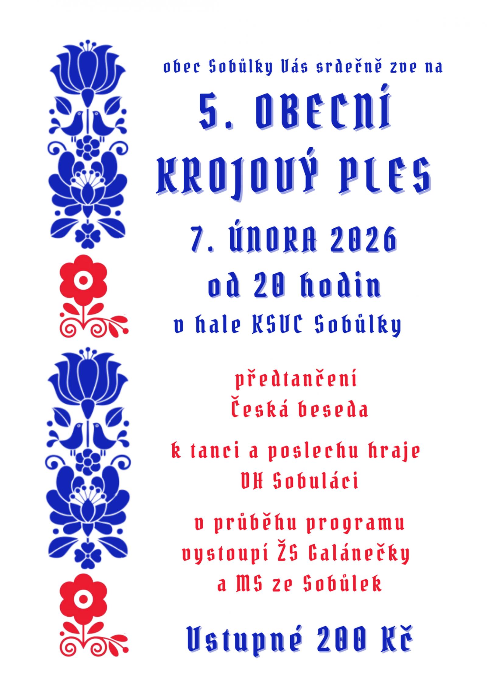 Srdečně zveme krojované i nekrojované na tradiční Krojový ples do Sobůlek. Předtančena bude česká beseda, vystoupí ŽS Galánečky a MS ze Sobůlek. K tanci a poslechu hraje DH Sobuláci. Těšit se můžete na bohatou tombolu, pestrý výběr drinků a další dobroty.