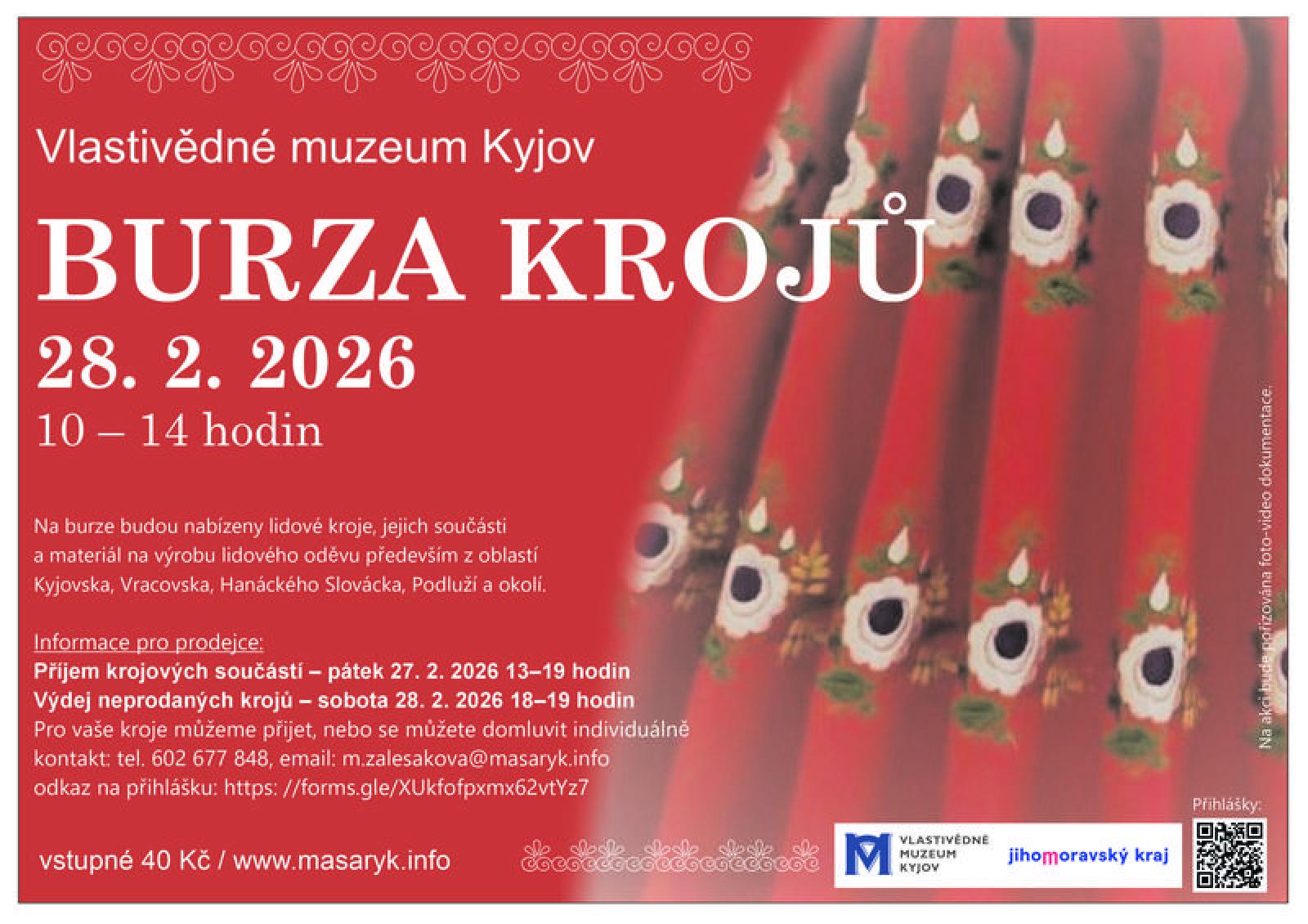 V nové budově Vlastivědného muzea Kyjov budou nabízeny lidové kroje, jejich součásti a materiál na výrobu lidového oděvu především z oblastí Kyjovska, Vracovska, Hanáckého Slovácka, Podluží a okolí. Pro vaše kroje můžeme přijet, nebo se na převzetí můžete domluvit individuálně. Kontakt: tel. 602 677 848, e-mail: m.zalesakova@masaryk.info