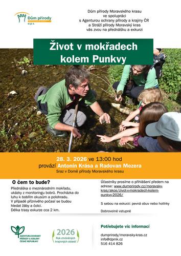 Přednáška o mezinárodním mokřadu, jeho obyvatelích z řad obojživelníků a ukázky z monitoringu bobrů. To vše nás uvede do tajů mokřadů kolem řeky Punkvy. Následovat bude exkurze do zajímavých míst mokřadů, kde se v případě příznivého počasí budou hledat žáby a čolci. Procházkou se také dostaneme do luhu k bobřím okusům a polohradu.