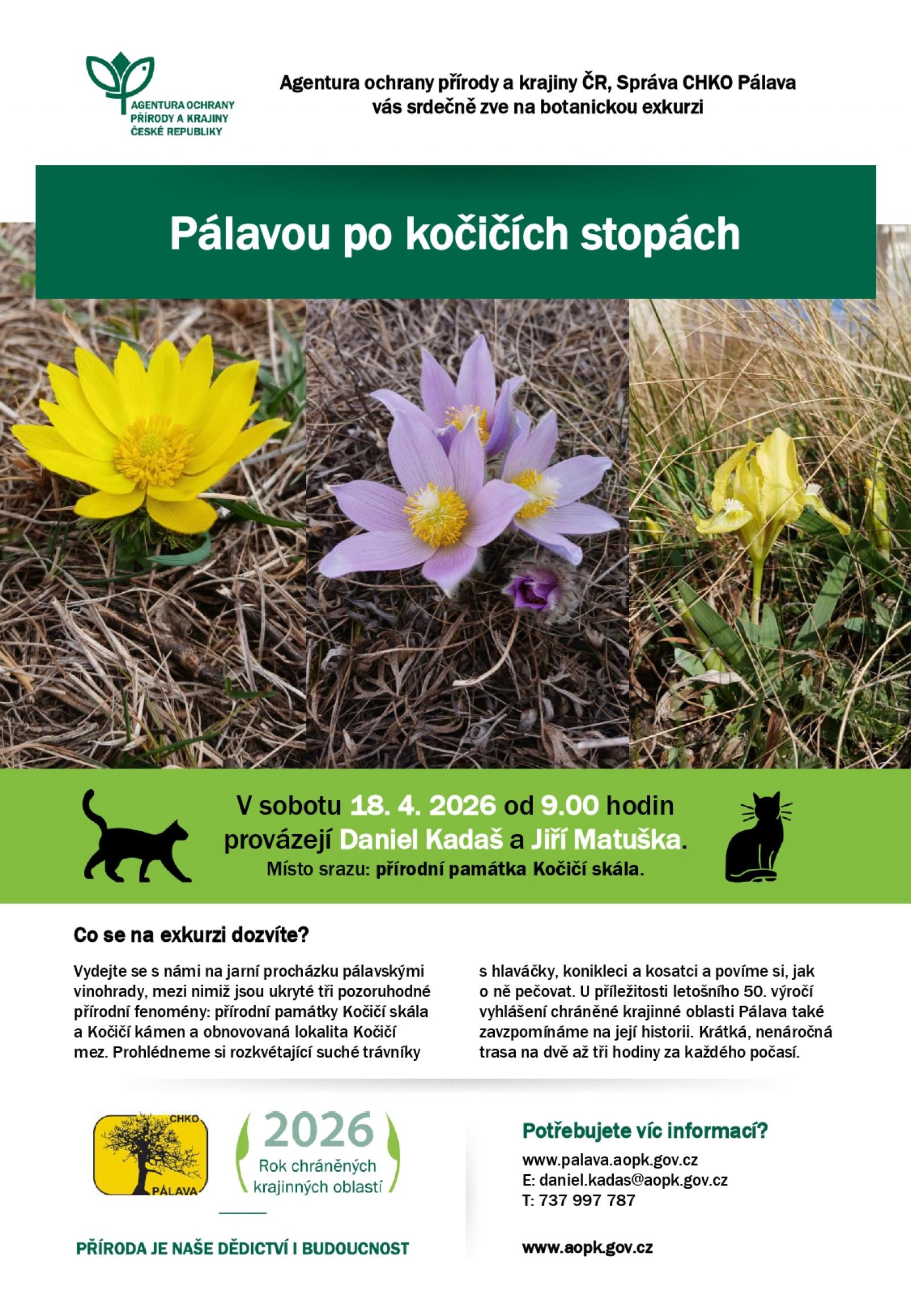 Vydejte se s námi na jarní procházku pálavskými vinohrady, mezi nimiž jsou ukryté tři pozoruhodné přírodní fenomény: přírodní památky Kočičí skála a Kočičí kámen a obnovovaná lokalita Kočičí mez. Prohlédneme si rozkvétající suché trávníky s hlaváčky, konikleci a kosatci a povíme si, jak o ně pečovat. U příležitosti letošního 50. výročí vyhlášení chráněné krajinné oblasti Pálava také zavzpomínáme na její historii.
