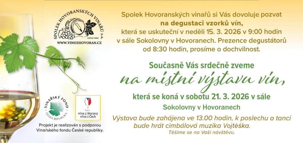 Od 13:00 hodin v sále Sokolovny Hovorany. Přijďte ochutnat vína místních vinařů i vinařů ze širokého okolí. V ceně vstupného je neomezená konzumace vína, degustační sklenička a katalog. K poslechu a tanci bude hrát CM Vojtěška. Bližší informace na www.vinozhovoran.cz nebo na FB.