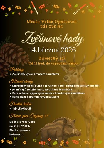 Srdečně vás zveme do Zámeckého sálu ve Velkých Opatovicích na Zvěřinové hody. Menu: zvěřinový vývar s masem a nudlemi, kančí řízky s bramborovým salátem, staročeský kančí guláš s houskovým knedlíkem, kančí výpečky se zelím a houskovým knedlíkem a jelení ragú se zeleninou a šťouchanými brambory; jako sladká tečka je připraven jablečný koláč. Samozřejmostí je i občerstvení - točené pivo Svijany 11°.