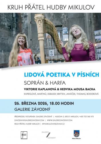 Koncert představí sopranistku Viktorii Kaplanovou a harfistku Hedviku Mousa Bacha. Uslyšíte mimo jiné díla těchto autoru: Vítězslava Kaprálová, Bohuslav Martinů, Leoš Janáček.