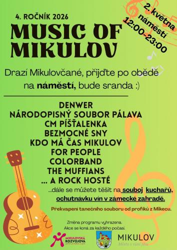 V sobotu 2. 5. 2026 od 12.00 do 23.00 hodin vystoupí na mikulovském náměstí místní kapely – Denwer, NS Pálava, CM Píšťalenka, Bezmocné sny, Kdo má čas Mikulov, For People, Colorband, The Muffians,...