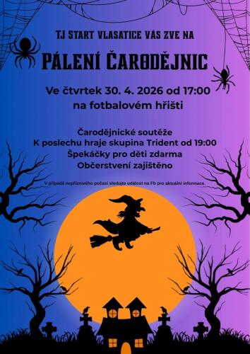 TJ Start Vlasatice všechny srdečně zve na Pálení čarodějnic, které se koná ve čtvrtek 30. dubna 2026 od 17.00 hod na fotbalovém hřišti ve Vlasaticích. Chybět nebude čarodějnická soutěž ani vystoupení kapely Triodent, která bude hrát od 19.00 hod. Občerstvení zajištěno, pro děti špekáčky zdarma.